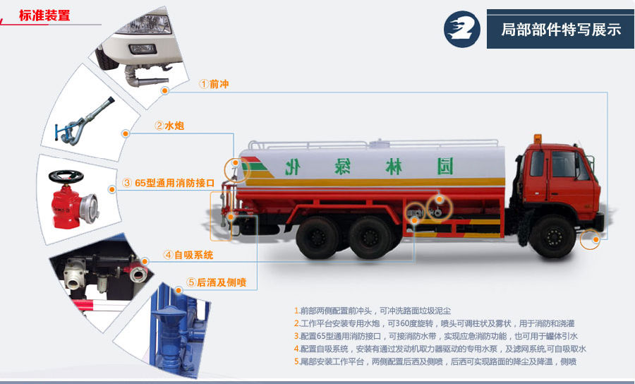 1,罐体有效容积10.67立方米;运输介质:水。轴距为4500mm时,整车长/前悬/后悬/罐体外形尺寸(长/长轴/短轴) mm分别为: 8440/1440/2500/(5000×2200×1350),轴距为3950mm时,整车长/前悬/后悬/罐体外形尺寸(长/长轴/短轴) mm分别为: 7640/1440/2250/(4200×2400×1520)。2,防护材料:Q235A碳钢,连接方式:左右侧面及后下部防护均采用焊接连接,后部防护断面尺寸(mm):130×50,后部防护离地高度(mm):470。3,ABS型号为ABS-E 4S/4M,生产厂家为威伯科汽车控制系统(中国)有限公司。4,文字喷图位置和车辆颜色可变化。 |
