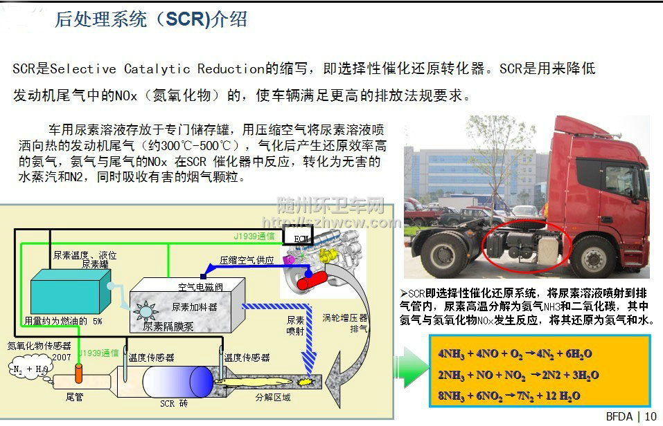 电控+SCR技术是通过使用选择性催化还原(SCR)技术,利用尿素溶液对尾气中的氮氧化物进行处理。车用尿素溶液存放于专门储存罐,用压缩空气将尿素溶液喷洒向热的发动机尾气(约300℃-500℃),气化后产生还原效率高的氨气,氨气与尾气的NOx 在SCR 催化器中反应,转化为无害的水蒸汽和N2,同时吸收有害的烟气颗粒;SCR即选择性催化还原系统,将尿素溶液喷射到排气管内,尿素高温分解为氨气NH3和二氧化碳,其中氨气与氮氧化物NOx发生反应,将其还原为氮气和水。