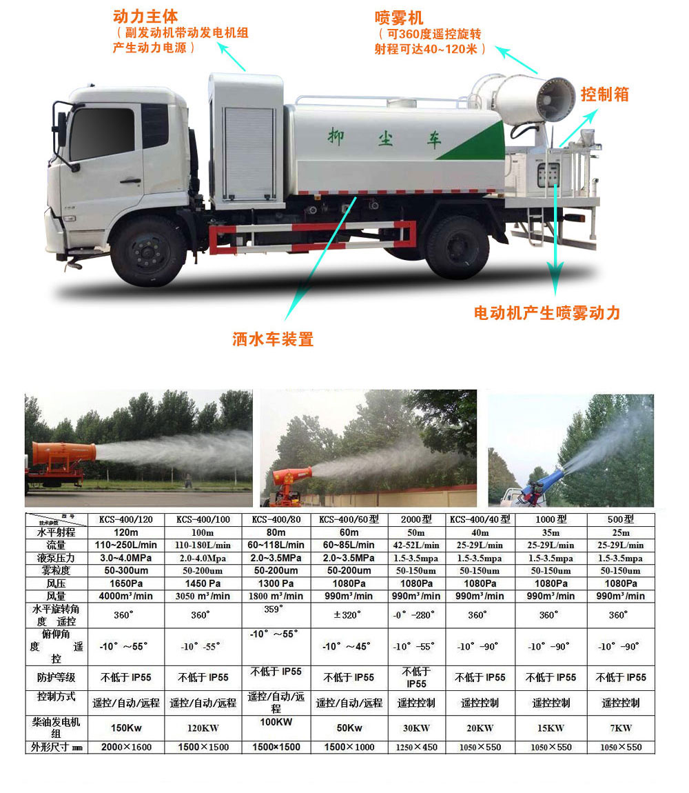 本车配备:5mm优质碳钢一次性卷压成型罐体,罐体容积8.5立方米(8吨),罐体后带工作平台,平台上安装电动遥控射雾风炮和绿化洒水炮,洒水炮可连续调成直冲状、大雨、小雨、毛毛雨,带安全护栏,配备杭州威龙大功率专用洒水泵,泵可自吸自排,安装过滤网,带消防接口,可通过消防栓进水,带自流阀,车上还配备康机大功率发电机一台。多功能抑尘车具备前冲(喷)后洒,带侧喷,罐体后带工作平台,平台上安装绿化洒水炮,洒水炮可全方位旋转,可连续调成直冲状、大雨、小雨、毛毛雨,带安全护栏,配备大功率专用洒水泵,泵可自吸自排,安装过滤网,带消防接口,可通过消防栓进水,带自流阀,随车选装20米绿化卷盘,可喷洒农药,罐体金属漆。